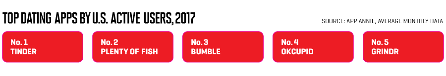 FOR ALL THE ATTENTION it garners, online dating is not a large industry—total U.S. revenue last year was $2.9 billion, according to IBISWorld. But it is fastgrowing: Usage of online dating platforms tripled among users ages 18–24 between 2013 and 2015, according to Pew Research Center.