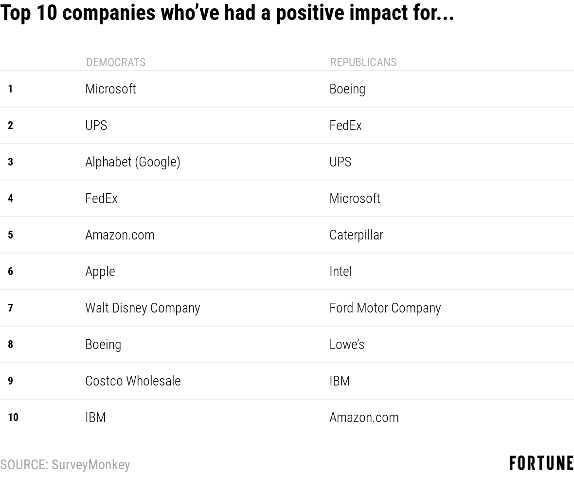 Republicans and Democrats also saw similar ideological divides, as well as some common ground, according to the survey results. The Republican top 10 includes nine of the rural top 10 (just substituting Caterpillar for Costco) and the Democrats’ picks include eight of the top companies making an impact according to Americans in urban areas (swapping Home Depot and Intel for Boeing and IBM).