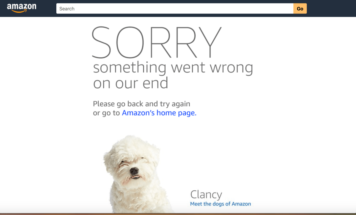 Instead of finding the best Amazon Prime Day deals, customers are being served up images of the “dogs of Amazon,” which appear when amazon.com is down, along with a notice saying “sorry, something went wrong on our end.”