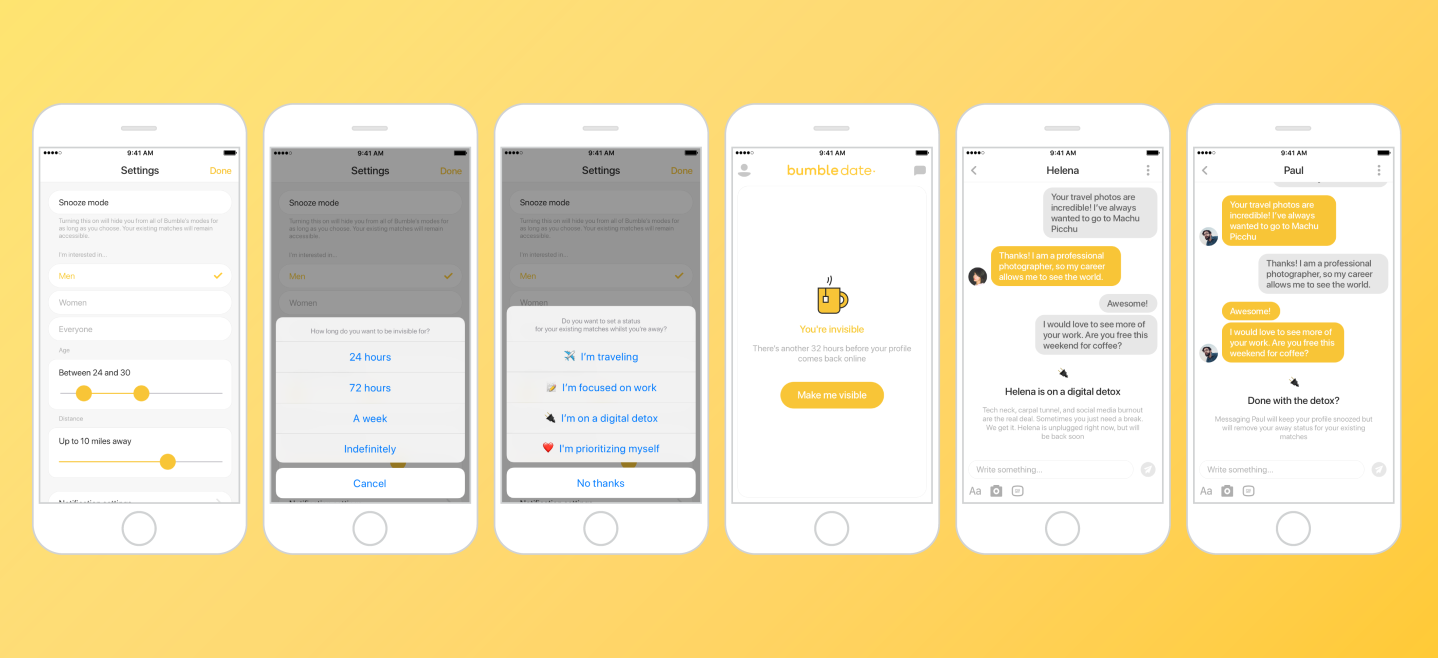 Bumble took inspiration after noticing that users were hacking the system to make their own version of a snooze function. Users would temporarily delete the app or turn off notifications and write in their bio that they were taking a break but would be back. The four-year-old dating app also had an option for users to hide their public profiles, preventing them from appearing for new potential matches but keeping their current conversations alive.