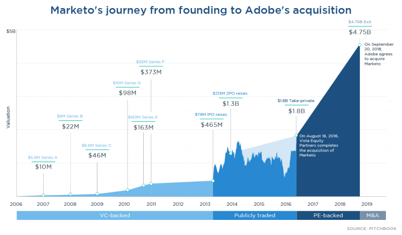 ADOBE-MARKETO DEAL: Adobe is acquiring Marketo, a marketing software company, from Vista Equity Partners for $4.75 billion, in hopes that the company will beef up its marketing tools to better compete with Salesforce and Oracle. Vista acquired Marketo for $1.8 billion in 2016. Below is a graphic on Marketo’s extensive deal history, thanks to our friends at PitchBook.