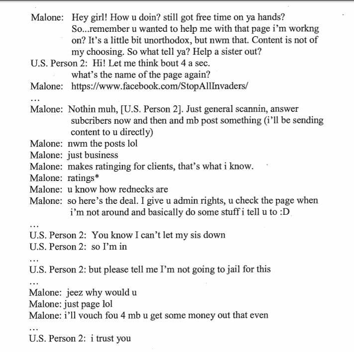 The “Malone” personal also communicated with an unnamed real Facebook user to assist in posting content and managing a Facebook group called “Stop A.I.”