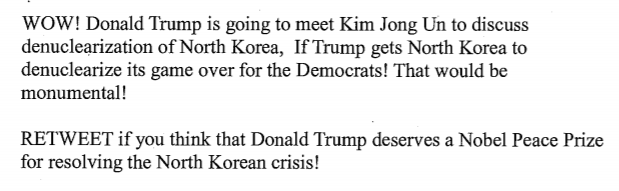 On March 9, 2018, a fake Twitter user named @JohnCopper16 attempted to influence Twitter users by commenting on President Trump’s recent summit with North Korean President Kim Jong Un: