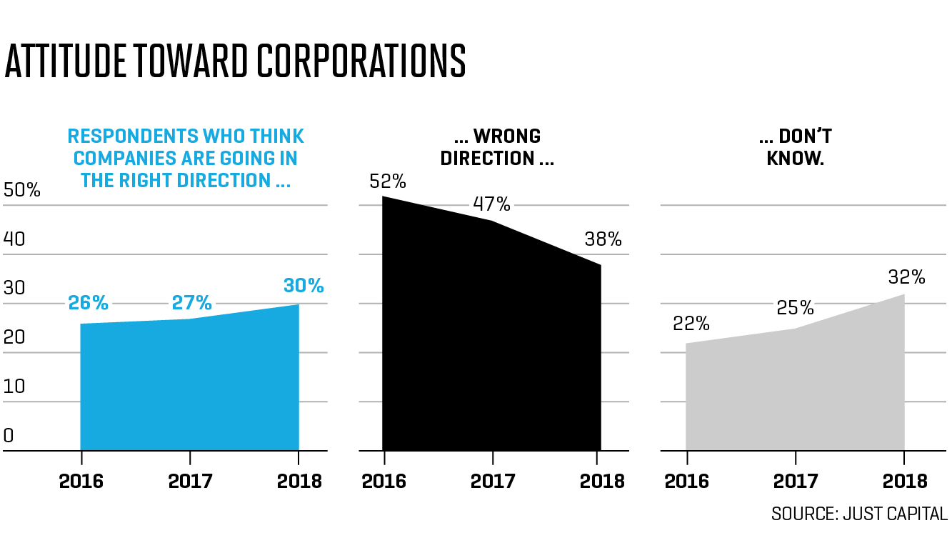 A new report from JUST Capital, a nonprofit founded by hedge fund manager Paul Tudor Jones that tracks and ranks companies on the business behaviors Americans care about most, found that a greater share of people—30%, up from 27% in 2017 and 26% in 2016—see business as heading in the right direction. A smaller share of the public—38%, down from 47% last year—view business as heading in the wrong direction. Meanwhile, 32% aren’t sure, up from 25% last year.
