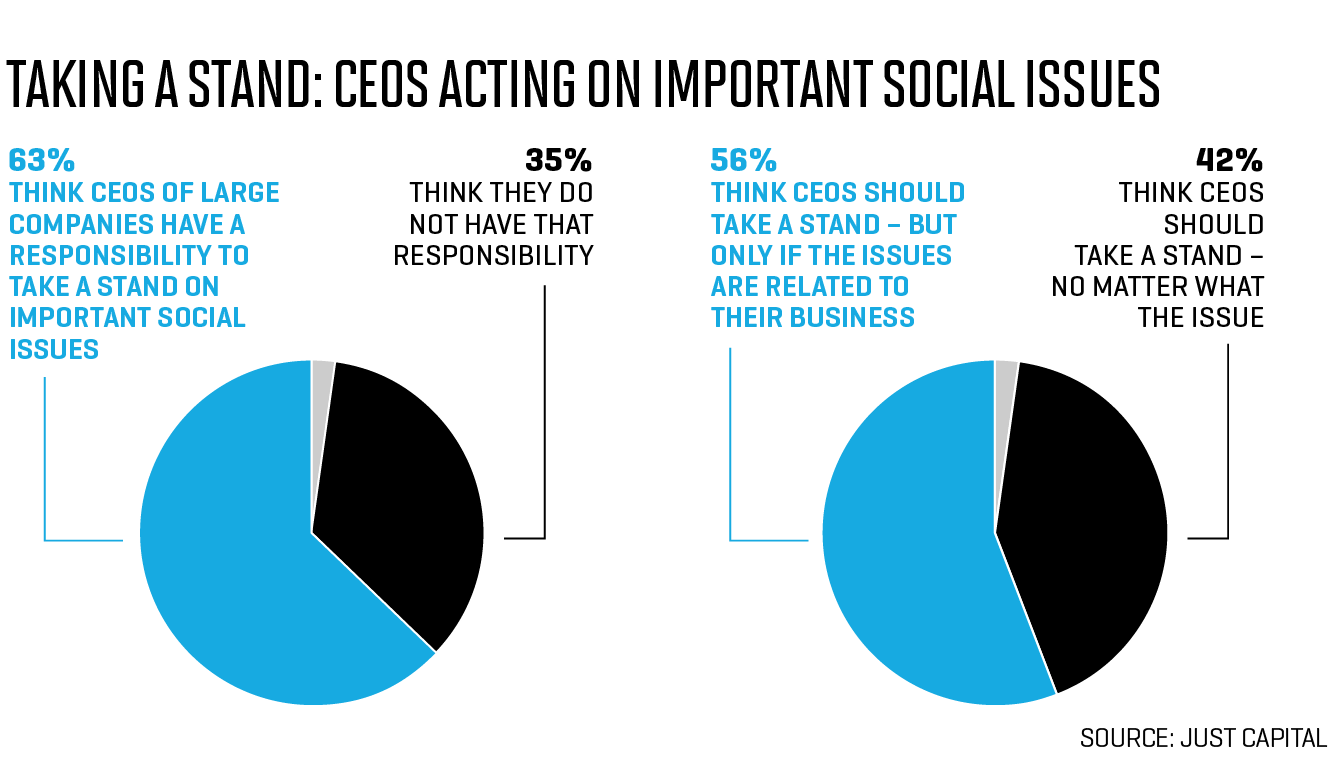 Indeed, JUST Capital’s survey results find that as Americans are warming up to business, they’re viewing the sector as more than simply a means for commerce; rather, they see it as a vehicle for tackling social issues too. More than half—56%—of survey respondents say CEOs should take a stand on social issues, but only those related to their business. Yet an even larger share—63%—say CEOs of large companies have a responsibility to take a stand on important social issues, regardless of the pertinence to their day-to-day operations.