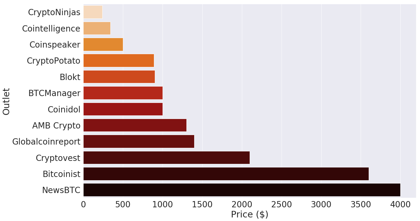 Holy payola. Breaker Magazine published an undercover investigation exposing pay-for-play in the cryptocurrency industry. Reporter Corin Faife asked 28 crypto outlets how much money he had to pay to place a sponsored post on their sites without disclosing the sponsorship. Out of the 22 outlets that replied, a dozen provided a quote. Below is a chart Breaker published featuring the names of the outlets and the price tags they presented.