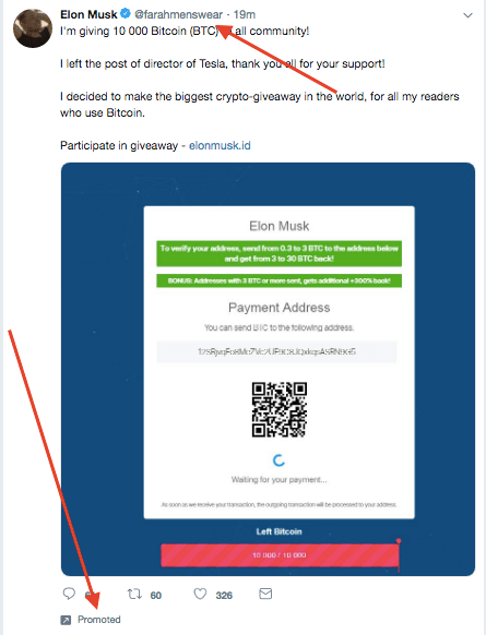 The hijacked account then becomes a vehicle to promote the scam, in which “Elon Musk” claims to have quit Twitter, and asks people to send Bitcoin so they can receive the proceeds of a big giveaway. The latest brand to have its account hijacked is Farah Menswear, a UK clothing outfit: