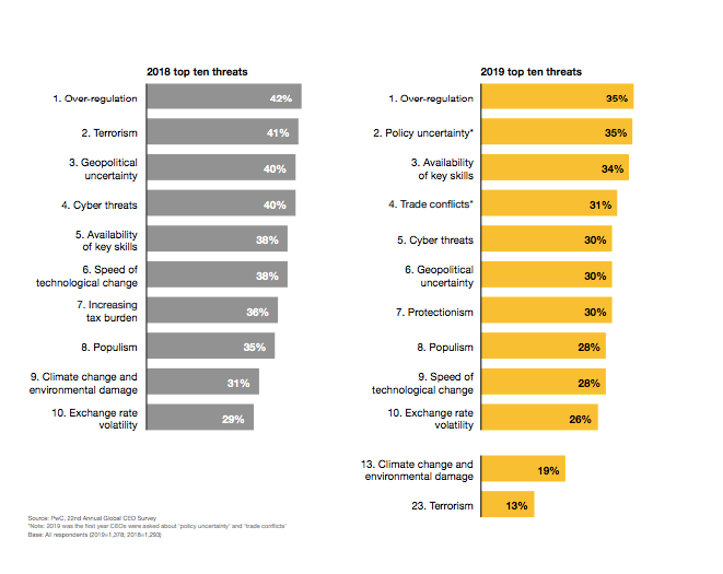That record increase, though, “is not that surprising,” the PwC report says. After all, “most major economic models have adjusted their 2019 forecasts downward,” and many economists consider a slowdown as overdue. Survey the geopolitical landscape—with its trade tensions, tightening monetary policies, and emergence of populist leaders—and it’s not hard to see what’s causing CEO worries to crop up. In fact, this year’s top “threats,” as identified by CEOs, reflect the turbulent landscape with political uncertainty, availability of key skills, and trade conflicts, replacing terrorism, geopolitical uncertainty, and cyber threats as Nos. 2, 3, and 4. Over-regulation was the No.1 threat both years.