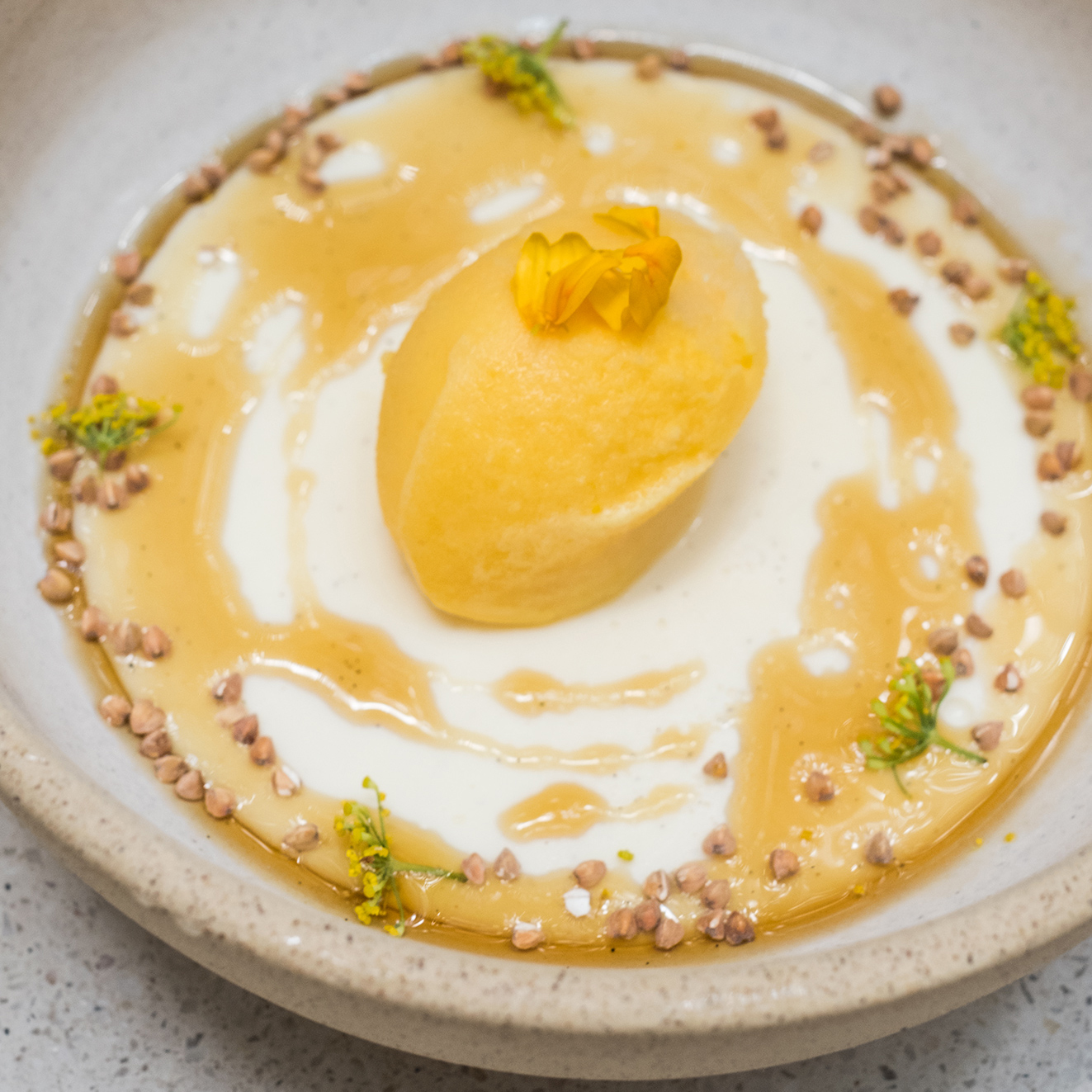 Three of Dominguez’s quesos, including a fudgy Camembert-style laced with black truffle, grace a cheese plate with strawberry preserves and chopped pecans drenched in honey. They bridge the savory side of the meal with desserts, which show zero drop-off in creativity or precision. There’s a crunchy and creamy napoleon of whipped yogurt, almond praline, caramelized purple plantains, and chips of fried dough, as well as a chamomile-dusted tart filled with thick, tangy cajeta, the goat’s milk version of dulce de leche. Topped with fennel fronds and refreshing mandarin sorbet, the supple panna cotta tastes like toast because the milk has been steeped with buckwheat and Cusic’s leftover bread. Even something as standard sounding as chocolate pot de crème makes your eyes roll to the back of your head thanks to a ripple of passion fruit caramel, like sweet-and sour lightning raking through the darkness.
