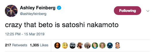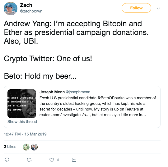 Satoshi for President? Crypto Twitter had until recently been fairly tepid on Beto O'Rourke, the former Texas congressman and Democrat who last week officially announced he is running for president. That changed with the revelation on Friday that O'Rourke was a member of the notorious hacker group Cult of the Dead Cow. Now, many are hailing the candidate as a potential hero of the crypto movement, wondering what other secrets he is hiding from his past: