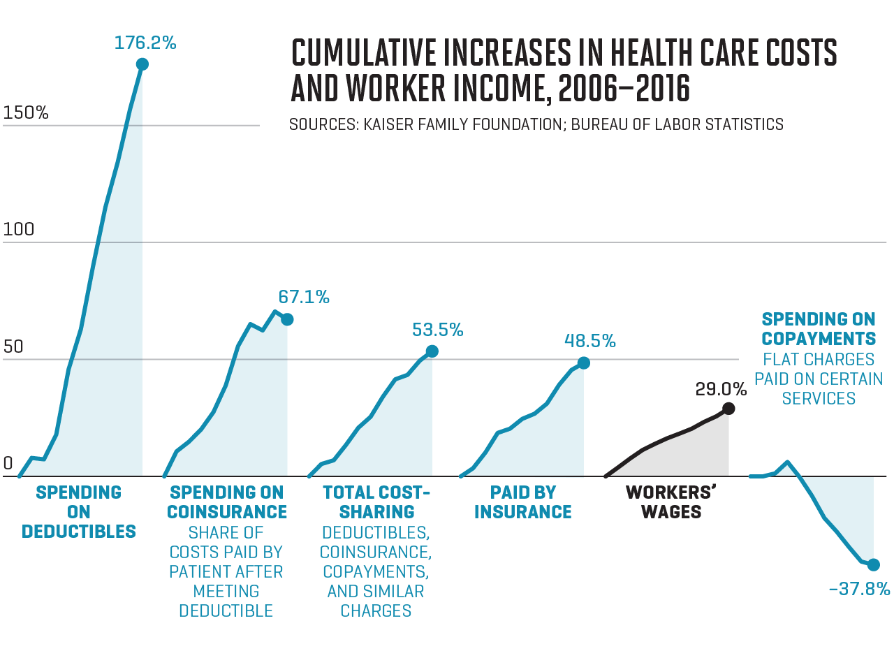 For many workers, health insurance is no longer what it once was. Health care costs borne by employees in the form of deductibles and coinsurance rose at a far faster rate than what employer-sponsored insurers paid for care between 2006 and 2016, according to the Kaiser Family Foundation. Even Medicare beneficiaries under the program’s current form (which includes private components and out-of-pocket spending) are expected to feel a bigger financial squeeze going forward.
