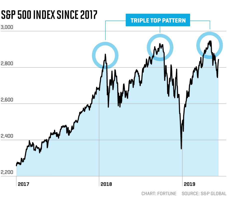 “We saw the formation of several bearish technical patterns taking shape,” says David Kudla, CEO of Mainstay Capital. The S&P 500, which started today at 2843, has been trading in a range for the past year and a half, hitting a high in almost exactly the same area three times: 2873, 2931, and 2946, then trading lower. In other words, if you invested at the high in the S&P 500 on January 21st of 2018, you’re actually below where you started. Analysts say the last indication of a triple top forming was in 2013, following highs going back to the 2000 dot.com boom. But it resolved itself by breaking through thoseresistance levels. In fact, it’s not a triple top unless the market actually falls through support. (The last time a triple top occurred was between 1965 and 1976, when the market fell more than 40%.)