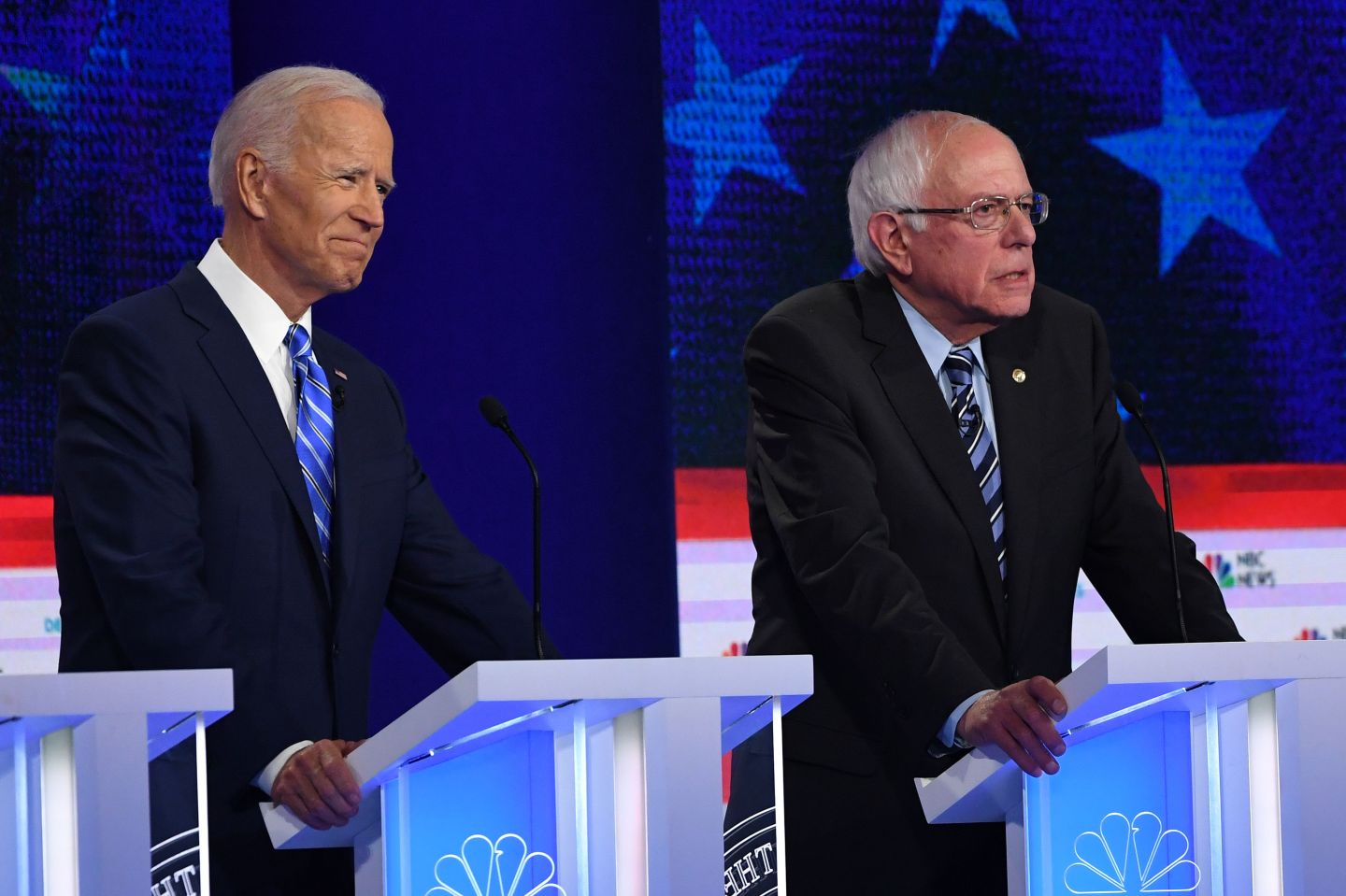 The two frontrunners for the Democratic presidential nomination faced-off center stage Thursday night in part two of the first debates and the stark platform contrast between former vice president Joe Biden and Sen. Bernie Sanders (D-Vt.) was on full display. The two camps, which are one-two in most polls with Biden holding an early lead over the field, are taking distinct approaches to the 2020 race. Biden is emphasizing his ability to topple Trump, and is leaning into a more traditional Democratic Party platform that builds off the Obama legacy. Sanders, on the other hand, seeks to shake up the party’s key policy initiatives. While, Biden views Trump as and aberration and his own campaign as a return to normalcy, Sanders believes Trump’s election symbolizes broader social and economic issues, demanding a more radical plan. Sen. Kamala Harris (D-Calif.) had the most buzzworthy clash with Biden of the night, challenging his opposition to federally mandated busing for school desegregation and work with pro-segregationist senators. But the moderators, a team from NBC news, consistently structured the questioning so Sanders and Biden would follow one another, and their contrasting core values were apparent throughout. A moment midway through the debate when all of the candidates were asked to describe their first priority in a few words spotlighted the differences. “We need a political revolution,” Sanders said. “People have got to stand up and take on the special interests, we can transform this country” Biden, after referring back to a previous question to praise Obama’s record on combating climate change, responded: “The first thing I would do is make sure we defeat Donald Trump, period,” On issue after issue, Biden often referred back to Obama administration policies and his own, lengthy senate record. Sanders, meanwhile, hammered on the need for a deeper transformation, a movement to take on the monied interests such as Wall Street, insurance companies, and the fossil fuel industry. While Biden advocated a quick return to the Affordable Care Act as a first step to improving health coverage, Sanders responded by invoking fresh ideas and “real change.” “We have a new vision for America. We think it is time for change, real change,” he said. “Healthcare is a human right. We have got to pass a medicare for all, single payer system.” As the poll frontrunner, Biden drew the most direct attacks from the other candidates. Rep. Eric Swalwell repeatedly referenced Biden’s age, later including Sanders, as he repeated the phrase “pass the torch.” Sanders, 77, and Biden, 76, have their relative advanced age compared to the field as a commonality, one that the senator from Vermont rushed to defend. “The issue isn’t about generation. It’s who has the guts to take on the big money interest who have unbelievable influence on the political life of this country,” Sanders said. When foreign policy was raised, Sanders was quick to point out his opposition to the Iraq War. “One of the differences that Joe and I have in our record is Joe voted for that war,” he said. “I helped lead the opposition to that war.” Both of them expressed their support for rejoining the Paris Climate Agreement and increased gun control legislation. And on immigration they took similar tacts as well, with Biden returning to his praise for Trump’s predecessor. “President Obama did a heck of a job, to compare him to what this guy is doing is immoral. We need to change the circumstances behind why they leave in the first place,” he said. Both candidates raised their hands when asked if they would support providing health care coverage for undocumented immigrants and changing crossing the border without inspection to a civil rather than criminal offense, an issue raised by Julian Castro in Wednesday night’s debate. “On day one we rescind every damn thing on this issue that Trump has done,” Sanders said on immigration. “Second, we have to look at the root causes [of the border crisis].” There were few direct attacks between Sanders and Biden, but their divergent paths to the same goal reflect the two dominant Democratic strategies for victory. As might be expected, the attacks on the biggest opponent not in the room were the sharpest and most frequent. “The American people understand that Trump is a phoney, a pathological liar and a racist and he lied to his people during his campaign,” Sanders said. “We beat Trump by exposing him for the fraud that he is.” Biden, given the final closing statement of the night, implored the nation to unify against a near existential crisis. “I think it’s important we restore the soul of this nation,” Biden said. “This president has ripped it out.” In terms of total time on the mic, Biden won the evening, topping all candidates with 13:19 of speaking time while Sanders came in third (10:58), behind Harris (12:19).
