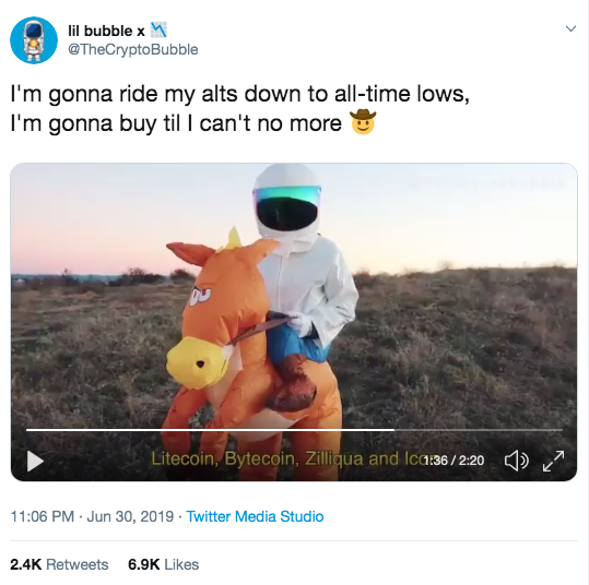 Ride ’til I can’t no more. It’s officially summer: It’s hot outside, crypto winter is finally thawing, and even Game of Thrones fans are done worrying about winter in Westeros. That means Crypto-Twitter has nothing better to do but create memes for our collective enjoyment, like this brilliantly entertaining cover of Lil Nas X’s “Old Town Road.” Someone using the handle @TheCryptoBubble over the weekend released a spoof version of the song on YouTube, entitled “All Time Lows.” (Due to technical difficulties, images aren’t currently showing up in The Ledger newsletter, but it’s worth clicking through to the video.)