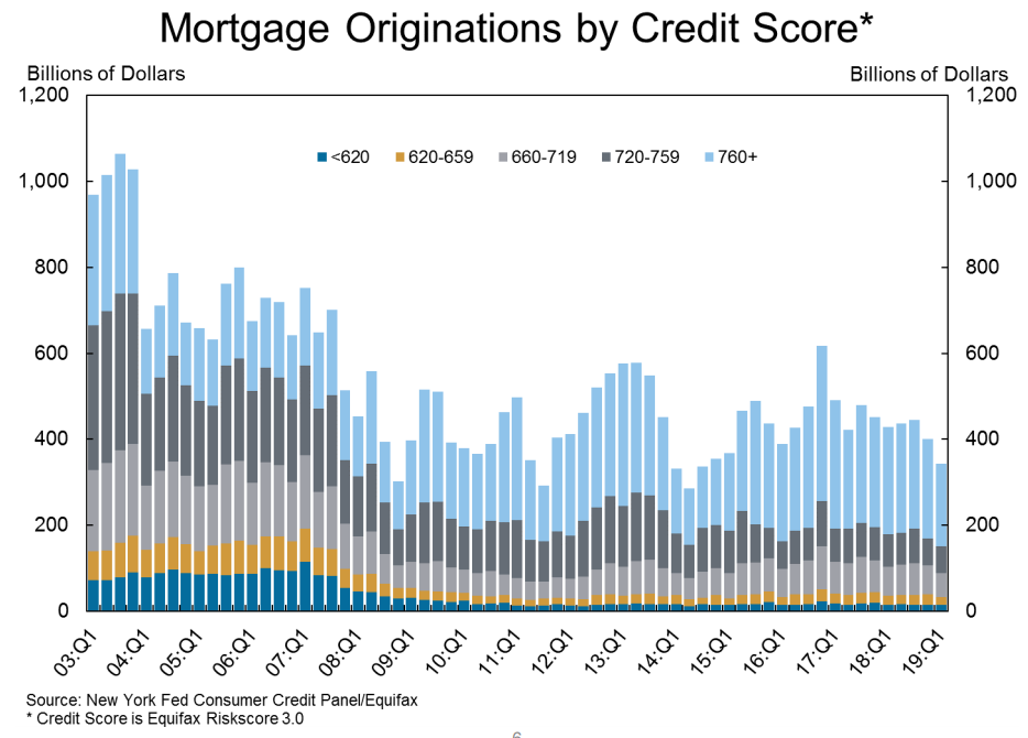 One of the reasons things got so out of hand during the Great Financial Crisis of 2007-2009 is because the debt was being issued hand over fist to low-quality borrowers. A combination of high debt levels with lower income and credit quality meant the first signs of trouble in the housing market sent borrowers into a tailspin. Both the debt service level and credit quality of borrowers have improved in the aftermath of the crisis.