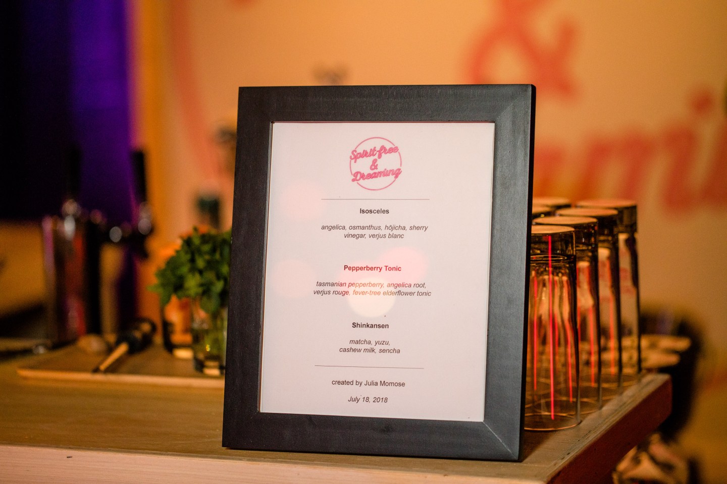 That idea of supporting those who want to stay sober is resonating with larger brands as well. The Mocktail Project’s installation was sponsored by Brown-Forman, the parent company of Woodford Reserve and Jack Daniel’s. Last year, William Grant & Sons—the group encompassing brands such as Hendrick’s, Glenfiddich, and Sailor Jerry—was one of the first major brands to enter the space: It made the bold move to throw an opening party for Tales of the Cocktail 2018 with no alcohol.
