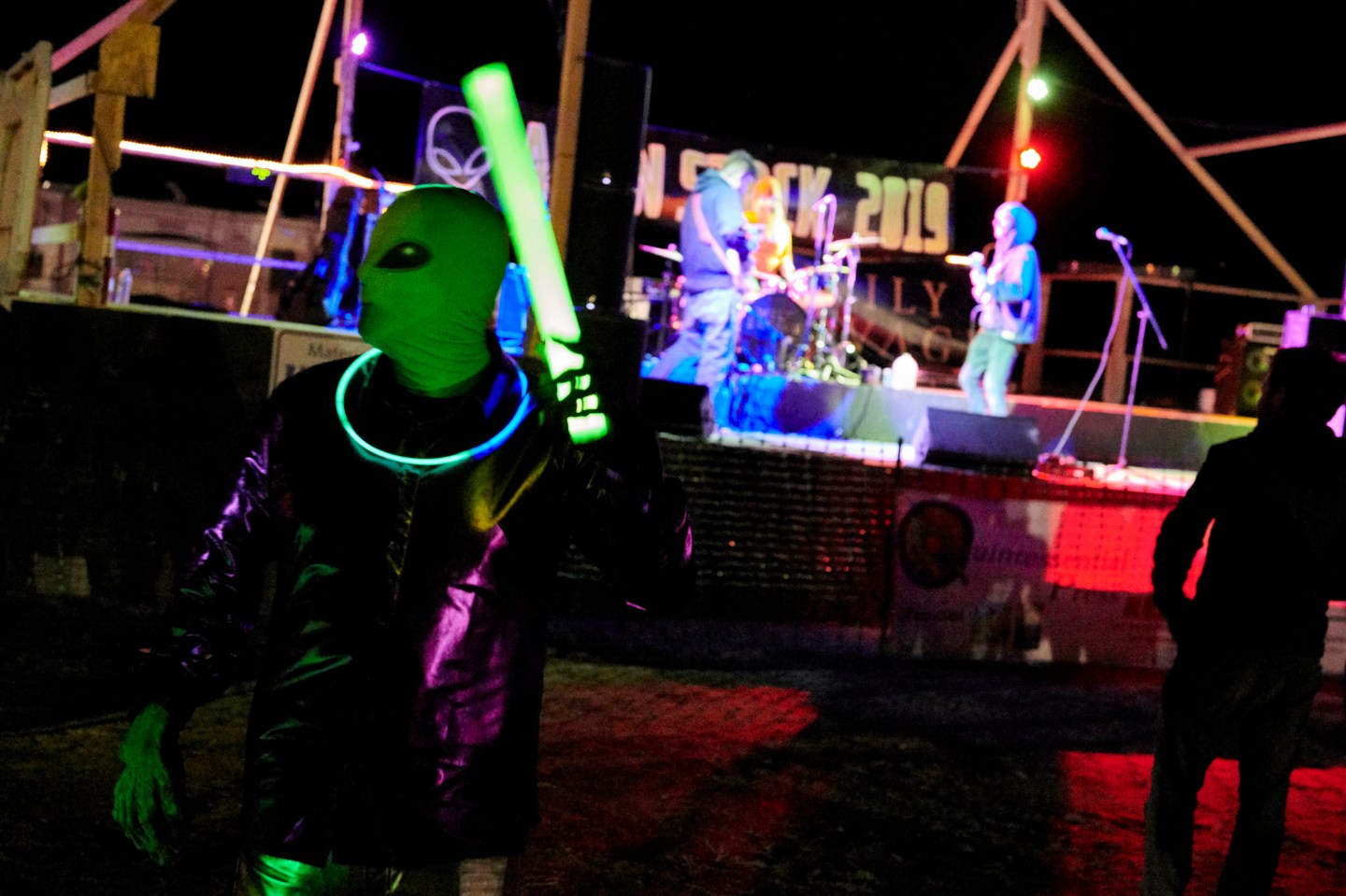 A music group called Wily Savage erected a stage Thursday near the Little A’Le’Inn in Rachel and began playing after dark for several hundred campers who braved overnight temperatures about 45 degrees (7 Celsius).