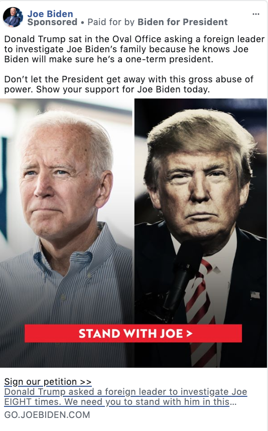 Biden has run several ads against Trump, including one that refers specifically to Trump’s call with Ukrainian President Zelensky. It reads: “Donald Trump sat in the Oval Office asking a foreign leader to investigate Joe Biden’s family because he knows Joe Biden will make sure he’s a one-term president. Don’t let the President get away with this gross abuse of power. Show your support for Joe Biden today.”