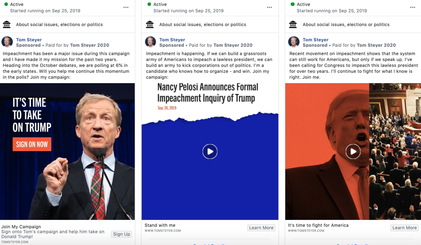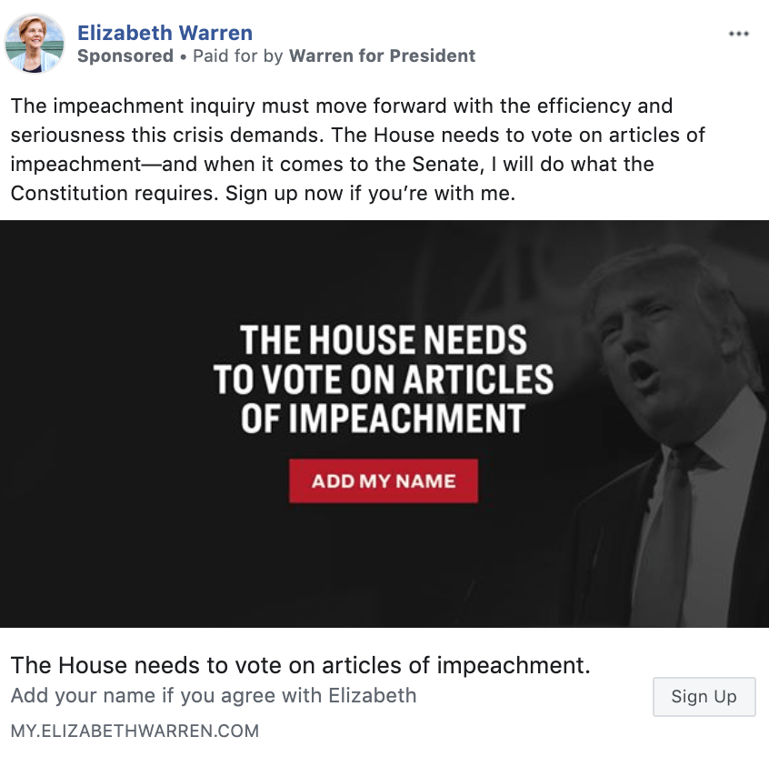 Other top-polling candidates, including Sen. Bernie Sanders and Mayor Pete Buttigieg did not appear to run any Facebook ads leveraging the impeachment inquiry. All of the aforementioned candidates have expressed explicit support for impeachment, with the exception of Buttigieg.