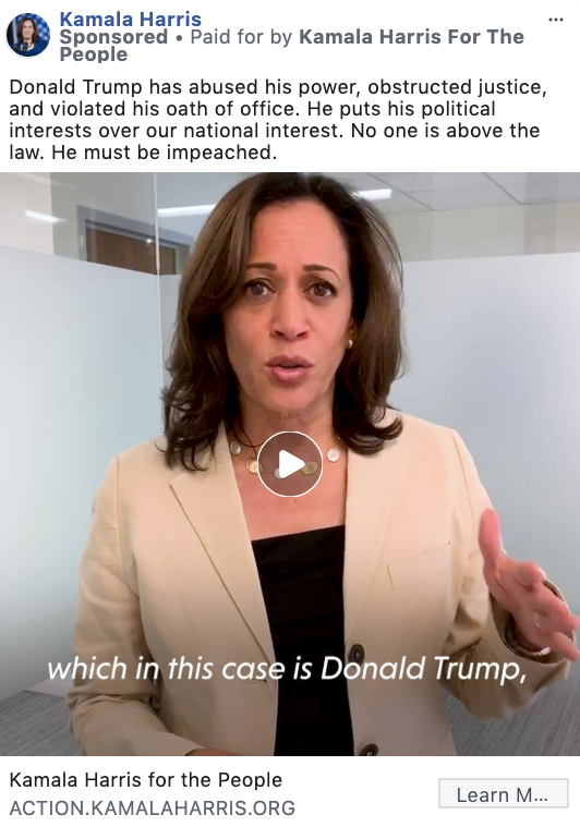 In an ad run by Harris’ campaign, she writes that “Donald Trump has abused his power, obstructed justice, and violated his oath of office. He puts his political interests over our national interest. No one is above the law. He must be impeached.”