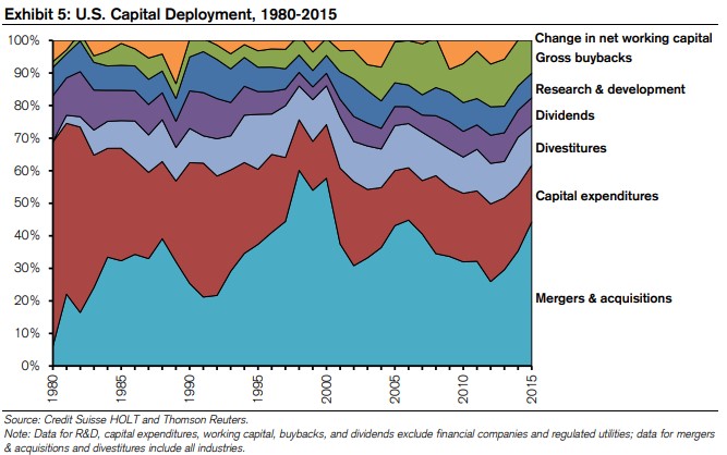 Share buybacks are a larger piece of the pie than they were in the early-1980s when the SEC changed a rule that made them more advantageous for companies to pull off, but they’re not the be-all, end-all. Mergers and acquisitions were nearly twice at large as dividends and share buybacks combined in 2015. Are politicians going to ban M&A activity as well?