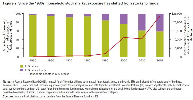 This chart from Vanguard shows how the mix of individual stocks and stock funds has changed overtime for U.S. households: