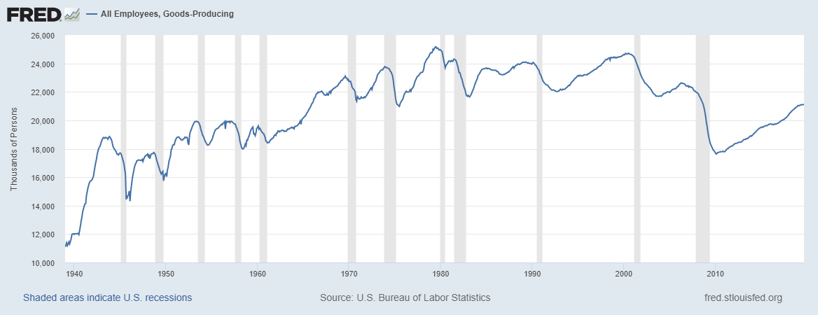 One more take on jobs comes from Adam Morehouse, a senior economist at Dun & Bradstreet, who says to look at jobs numbers in the goods-producing industries (available at the Bureau of Labor Statistics). “Since 1988, employment in the goods producing industries has typically peaked on average 16.6 months before an official recession has been called,” he says. The good news is that they haven’t yet seen that peak in goods producing employment. But the graph below, also from the St. Louis Fed, shows how the pattern works: