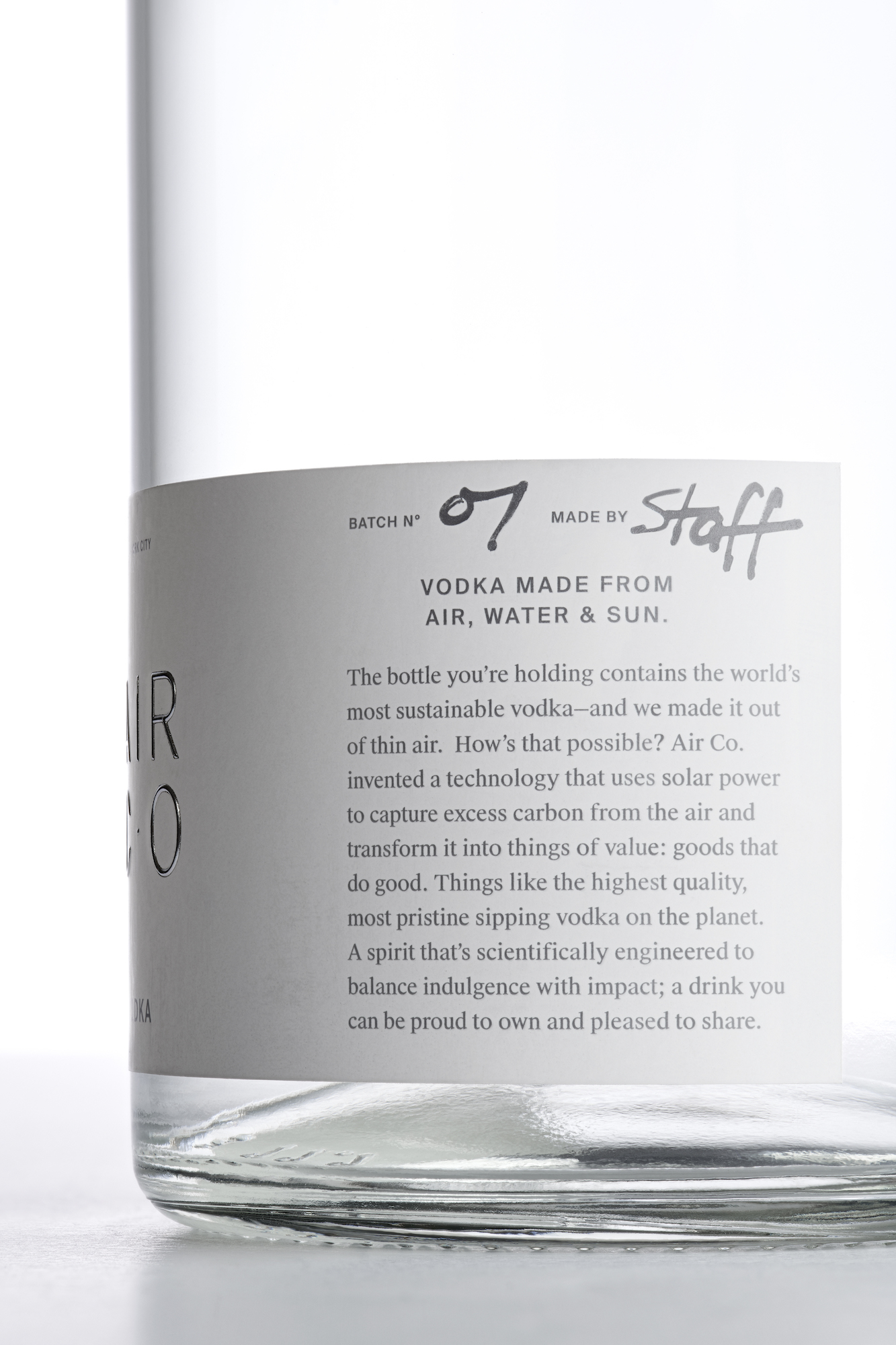 What helps Air Co. stand out is the marketing. This vodka is “Made From Air, Water & Sun.” And it is proclaimed to be the world’s “most sustainable vodka” ever.