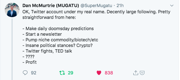 A long-notorious Finance Twitter figure known only as SuperMugatu - after Will Ferrell's nefarious fashion mogul in the Zoolander movies - came out from behind the curtain this week. SuperMugatu, in the real world, is Dan McMurtrie, the Millenial founder of Tyro Capital Management. A twentysomething naming his fund "tyro" - meaning novice or beginner - is a sterling example of the brazen smarm with which SuperMugatu tackled topics in finance and investing. Hopefully he'll keep that edge under his real name.
