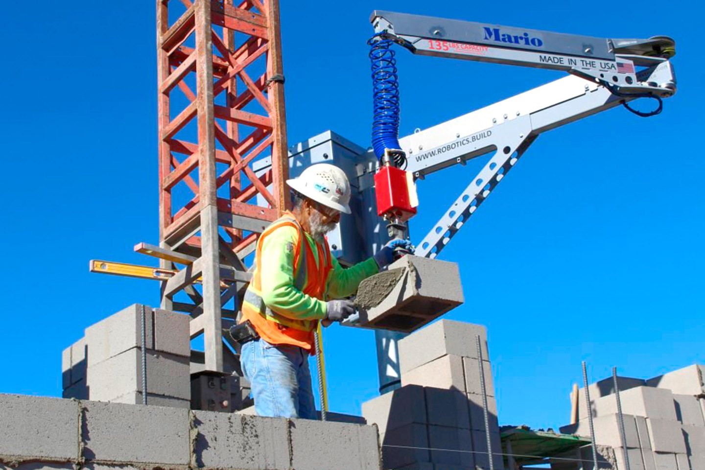 SAM, a clawlike metal arm extending from a cage, moves back and forth along the walls, buttering and layering a brick every eight to 12 seconds. Nearby, another robot called MULE uses a burly 12-foot arm to lift heavy cement blocks for workers, who then guide them into place.
