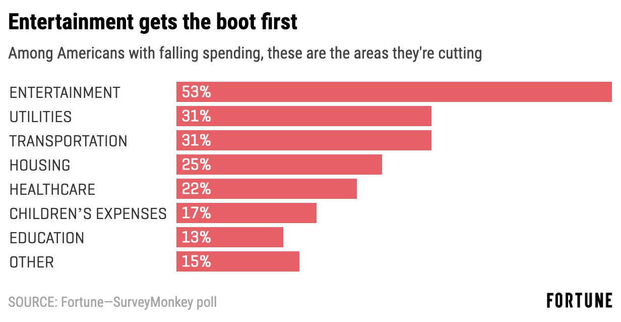 The minority of households (10%) who are actually cutting household spending, are targeting entertainment expenses first. That makes sense: if you have a budget gap you’d likely drop a streaming service or scale back weekend getaways before cutting necessities.