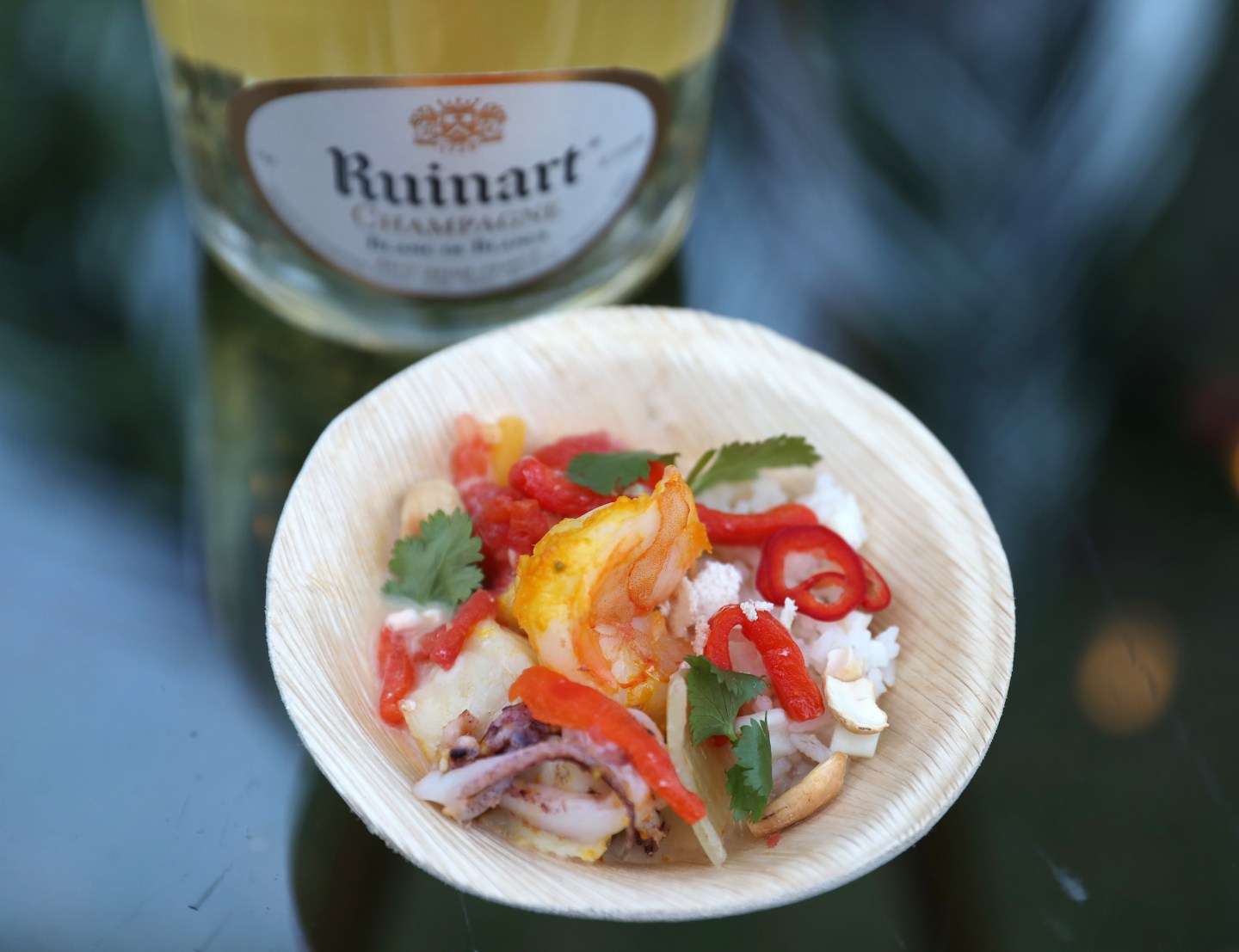 He dips a spoon into the pot and deems the stew in need of more heat. A sous chef hustles over with a ramekin of sliced Fresno chiles. “I like to do things that are not always conventional to what we do,” Boulud says, scattering cilantro leaves over the pot. “Does everything I do represent my restaurants? No, but this represents the relationship between me and Vik, how I love his country, how I love the food of his country, the people of his country, and his art. And I love the fact that he created art around something so incredible as Ruinart.”