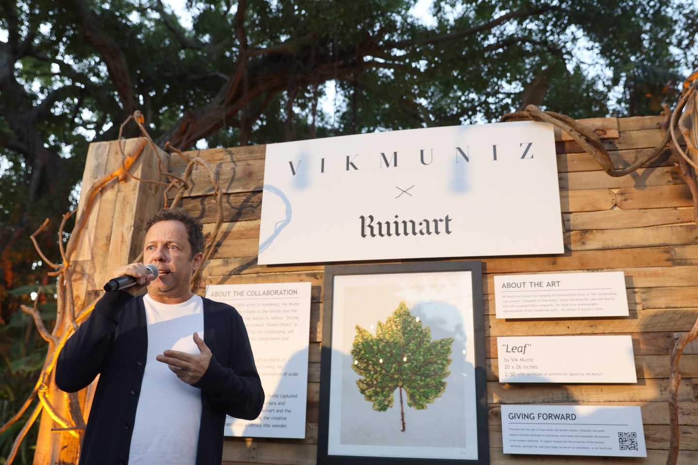Muniz was ruminating on the idea of repurposing materials from the natural world with his latest job: serving as the 2019 artist in residence for Ruinart, France’s oldest Champagne house, founded in 1729. He used blackened wood, charcoal, and leaves that had fallen from Chardonnay vines to create images intended to evoke how time and the elements change wine, people, and, sure, the world writ large. When Ruinart’s powers that be asked Muniz who he’d like to prepare the food at an Art Basel Miami Beach sale of his work (proceeds of which went to a Brazilian organization fighting to protect the Amazon rain forest), Muniz offered one option.