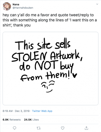 The story begins on Dec. 3, when an artist going by @Hannahdouken on Twitter posted an image of hand-drawn text reading, “This site sells STOLEN Artwork, do NOT buy from them!” And asked followers to reply that they wanted the image on a shirt: