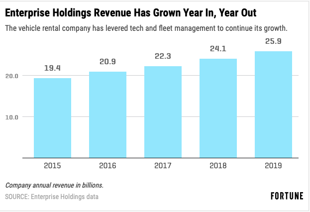 Enterprise, which owns its namesake brand along with National Car Rental, Alamo Rent A Car, and Enterprise Fleet Management, is by far the biggest car rental agency: its 2018 revenue came to $25.9 billion, almost three times that of Avis Budget or Hertz Global Holdings, which are similar in size.