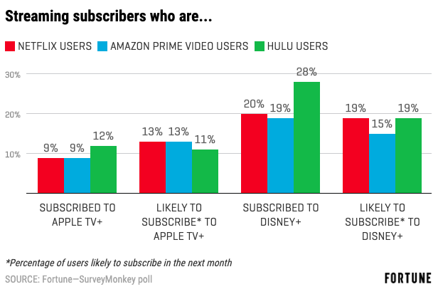 But is Netflix seriously threatened? Now that we’re a month in, it’s time to pull the data and see how well Apple TV+ and Disney+ are actually doing. Fortune-SurveyMonkey set out to get the answers by polling more than 1,200 Americans* on whether they’ve signed up to the new platforms. In October, we conducted a streaming poll that predicted that Disney+ would be the strongest new competitor to come out of the gate. Now, we’ll contrast where everyone stood before launch against where they stand after launch.