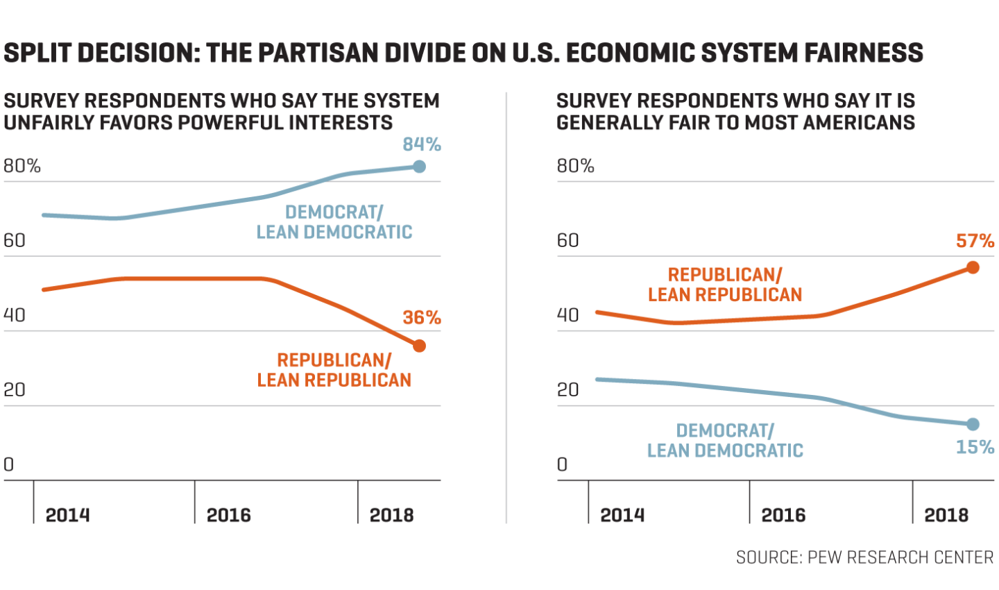Consider the fundamental question of whether the U.S. economic system “is generally fair to most Americans” or “unfairly favors powerful interests,” as the Pew Research Center has posed it for the past five years. Overall sentiment has barely budged: About 33% of U.S. adults say it’s fair, and 63% say it’s unfair. But in just the past three years, Republicans and Democrats have polarized on the issue, with Republicans now far more likely to say it’s fair, and Democrats far more likely to say it isn’t.