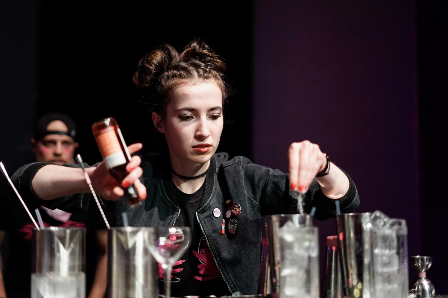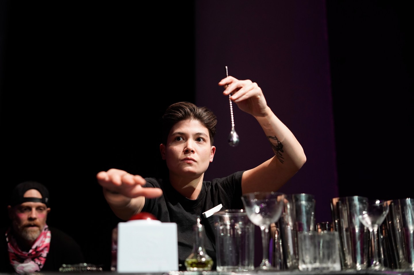 Contestants are brought onto the stage two at a time. Four judges each make a drink order. The women start making those orders while fans, some holding massive signs, cheer them on. When done, a contestant hits a buzzer on her respective bar to stop the timer. For an idea of what you might be up against: four craft cocktails are often made in less than two minutes.