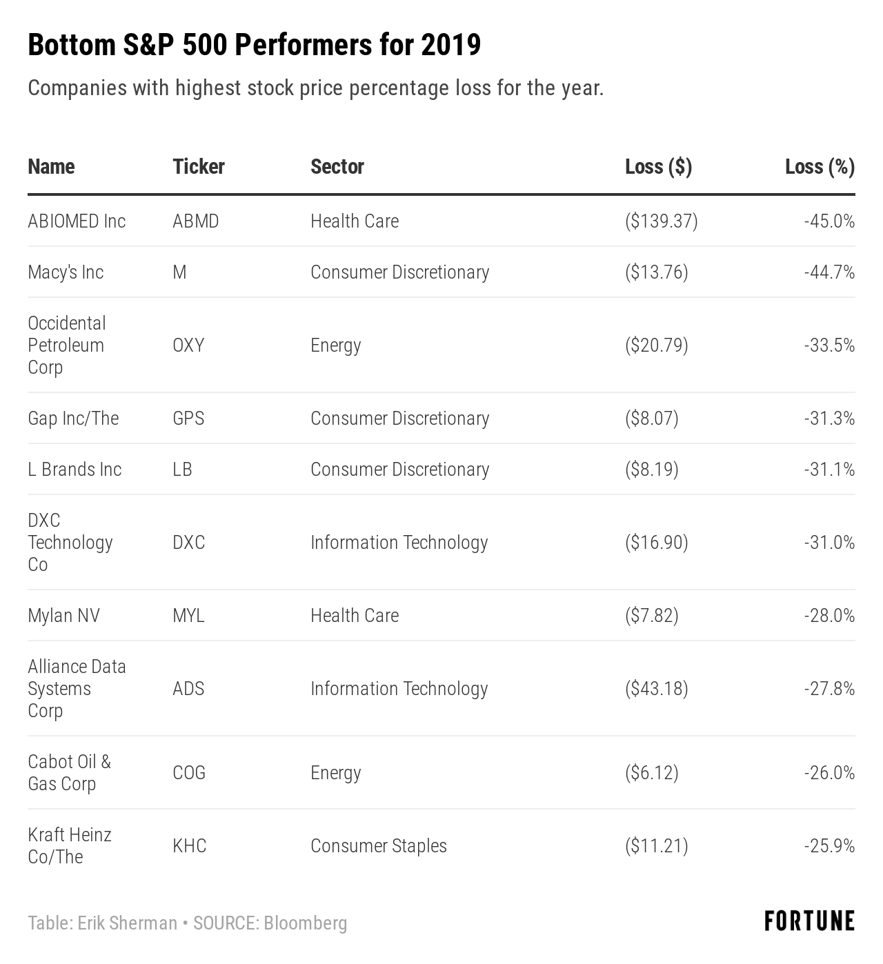 There has also been big variations in performance by company type. The table below shows each of the S&P’s 11 industry sectors along with the number of companies, median (middle-of-the-pack) share performance during 2019, and the percentage of companies in the sector whose shares lost value for the full year.