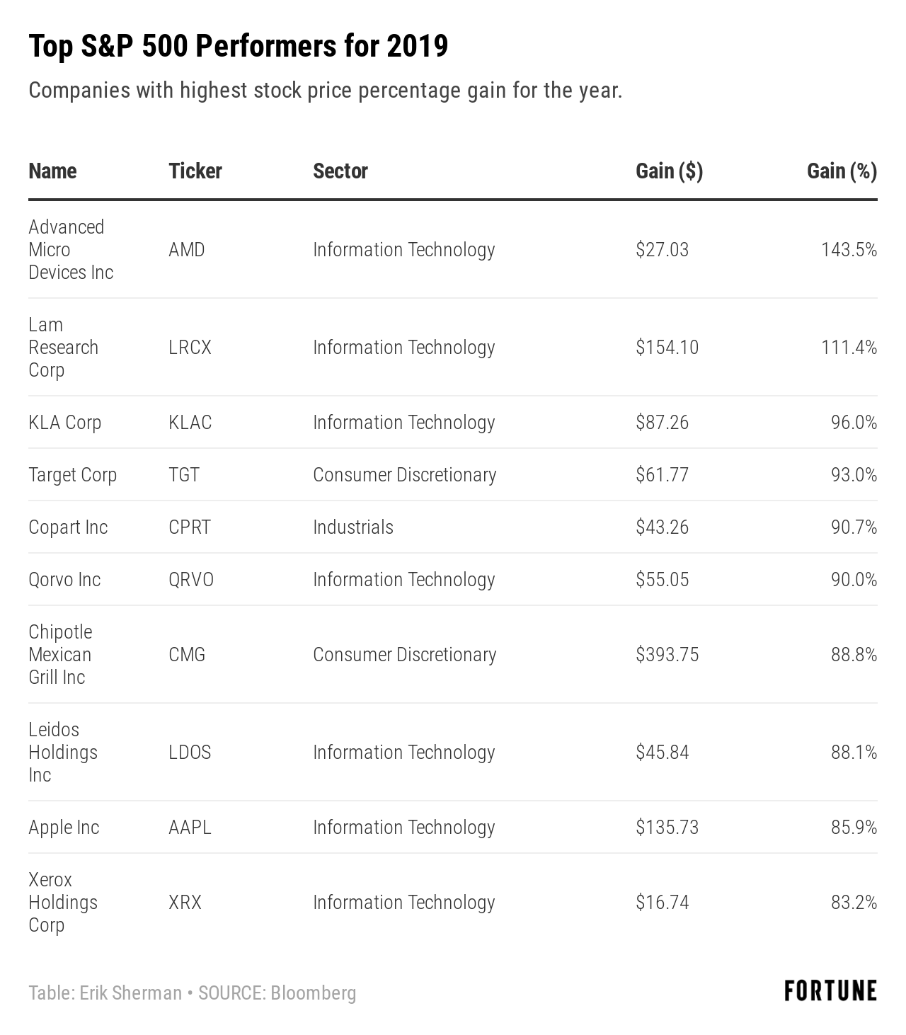 And then there’s the inconsistency. The upper end of gainers in the S&P 500 experienced stock price gains far beyond that of the index’s near 29% rally. The top 10 price increases ranged from 83.2% for Xerox to 143.5% for Advanced Micro Devices, again using closing numbers that include splits but not dividends and measuring from the close of Jan. 2 to that of Dec. 31.