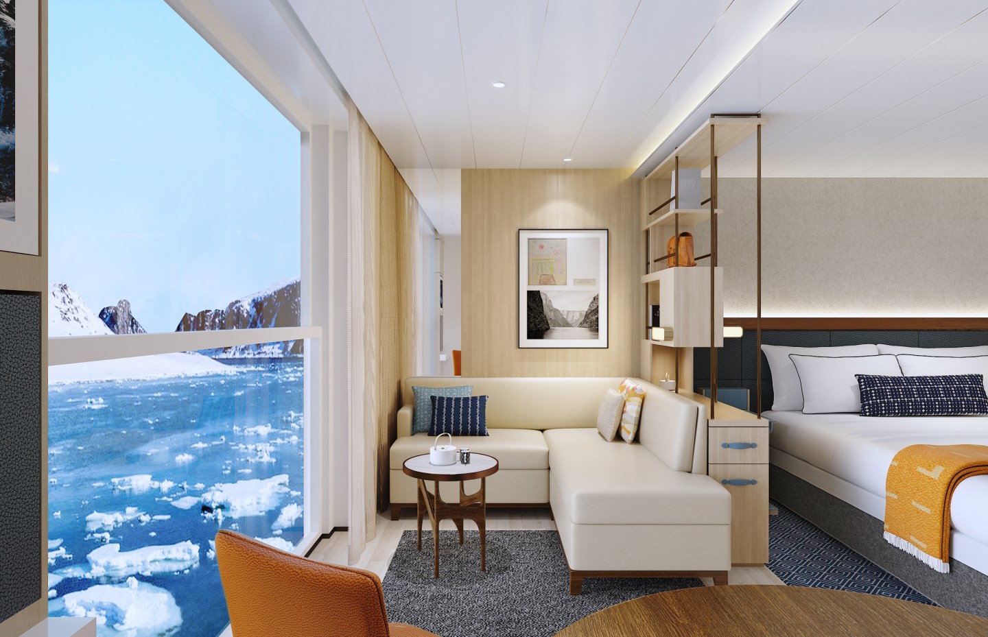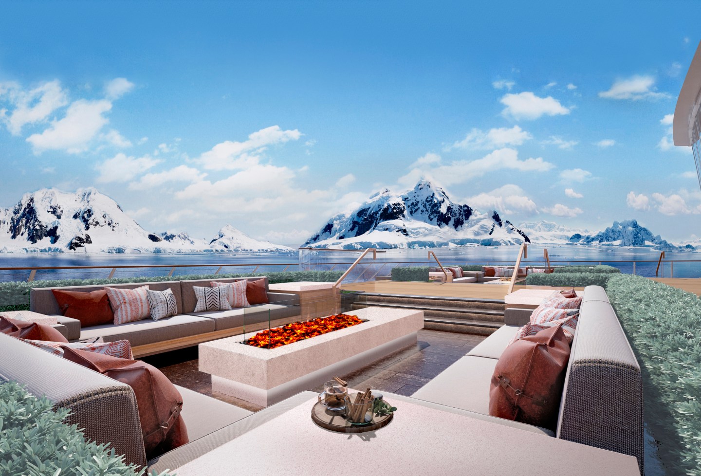 Guests will also be able to take in lectures at The Aula, a panoramic auditorium at the stern. Inspired by the University of Oslo’s famed ceremonial hall where the Nobel Peace Prize was historically awarded, The Aula can seat half the ship’s guests at one time and will offer a dynamic venue for lectures and entertainment, with floor-to-ceiling windows and 270-degree views. Adjacent to The Aula through sliding glass walls is the Finse Terrace, an outdoor lounge area with couches and warming lava rock “firepits” with panoramic views of the surroundings. The two spaces are designed to create an indoor-outdoor al fresco experience for guests to be immersed in nature.