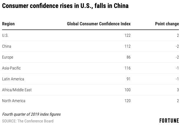 The Conference Board’s Global Consumer Confidence Index for the U.S. inched up 2 points to 122 in the fourth quarter of 2019. That’s just under the record high of 123 that the U.S. achieved in the first quarter of 2018. An index reading at 100 or above is considered positive.