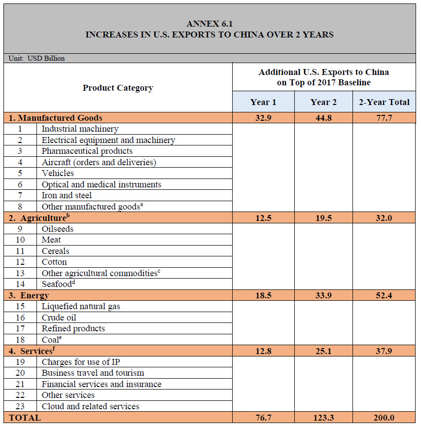 There is also $200 billion over 2017 export levels of planned sales of agricultural and industrial goods between 2020 and 2021. The table below, from the agreement, shows the numbers.