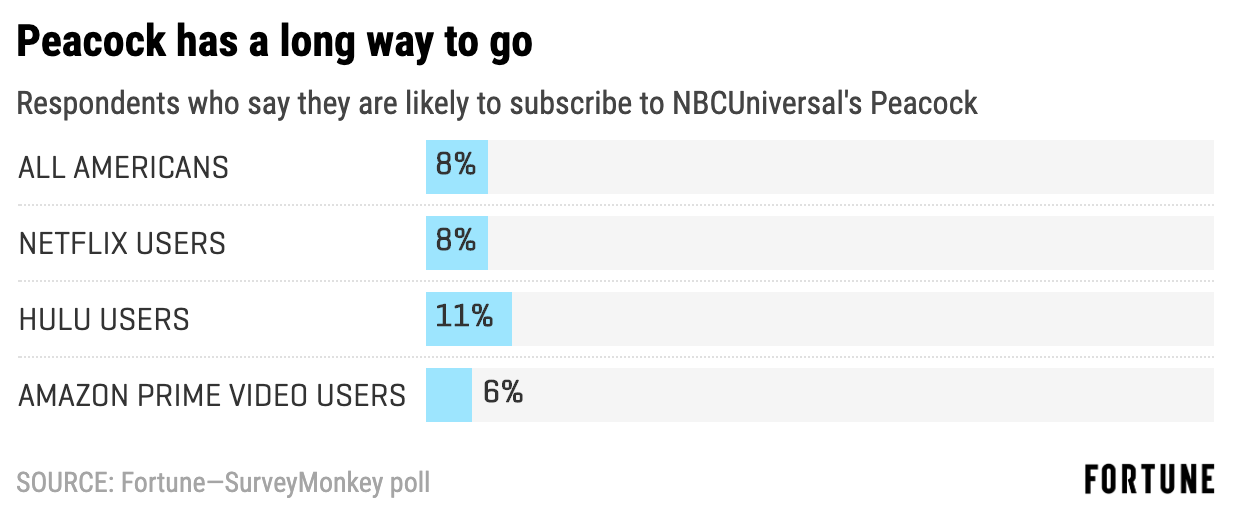 A Fortune-SurveyMonkey poll conducted at the end of 2019 found that 11% of Hulu users are likely to subscribe to Peacock, compared to 8% of Netflix users, and 6% of Amazon Prime Video users. Those early poll numbers, prior to the free option being announced or a major national ad campaign, tell us both that Peacock has a lot of work to do before it debuts nationally on July 15 and that it is primed to give its biggest challenge to Hulu.