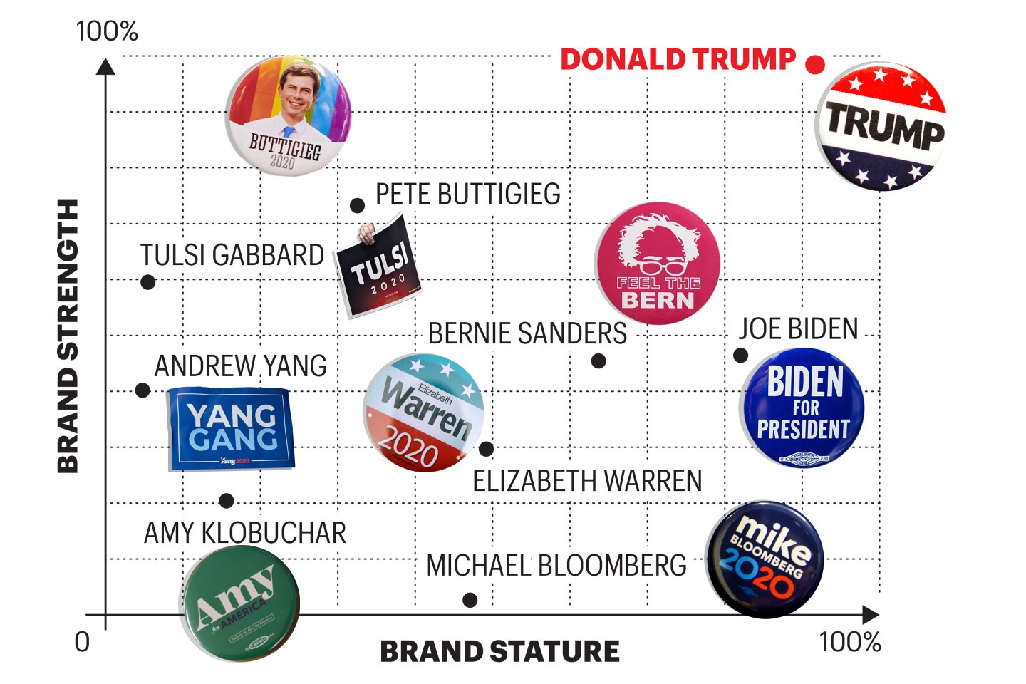It’s true that in 2016 brand Hillary got more votes than brand Trump. But both campaigns knew the rules of the electoral system. Clinton’s brand stature seemingly gave her a lock on the big industrial states that Obama had won in 2008 and 2012: Pennsylvania, Ohio, Michigan, and Wisconsin. But Trump won all of them in 2016. Brand strength—the fact that he was perceived as differentiated and relevant—carried the day. Trump’s high brand stature may seem a mystery in light of his low approval ratings. But while they’re low by historical standards, says FiveThirtyEight, his favorable percentages are about the same as Barack Obama’s were at the same point in his first term, in the low to mid-40s. They’re also about the same as the current ratings of the dominant Democratic challenger, Joe Biden, according to the RealClearPolitics average of polls. In addition, since brand stature depends not just on esteem for the brand but also on knowledge of it, Trump’s TV-based fame is a powerful advantage over all other candidates. In mid-2015, barely a month after declaring his candidacy, his name recognition was 92%, a Gallup poll found, the same as Joe Biden’s is today, says the Morning Consult survey research firm. Now, with the added fame of being President, Trump’s overall brand stature is slightly greater than Biden’s.