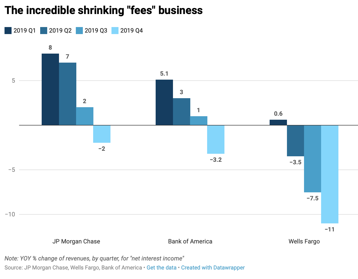 In early 2019, net-interest income was relatively high for many big banks. The more the Fed cut, the more this metric declined. Net-interest income at J.P. Morgan, perhaps the most robust Wall Street titan in recent quarters, shrank 2% at the end of 2019, well below the 8% growth rate it enjoyed in the first quarter of the year. At Bank of America, meanwhile, net-interest income fell 3.2% last quarter. At Wells Fargo, it fell a startling 11%.