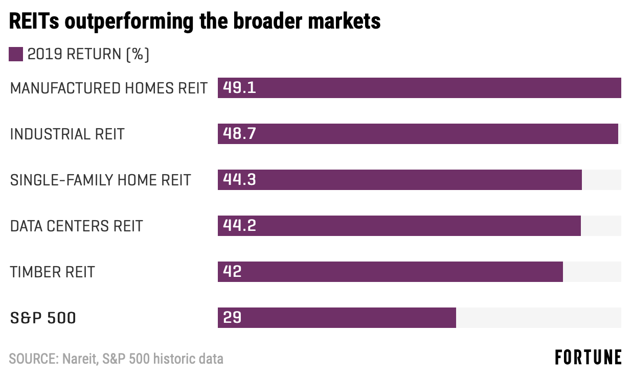 Nobody would complain about the S&P 500 performance in 2019. But select REITs had an even better year. If you looks closely at the chart you’ll see the hottest REITs reflect bigger business trends. There’s been a boom in data center construction, for example. Not surprisingly data center REITs are flying.