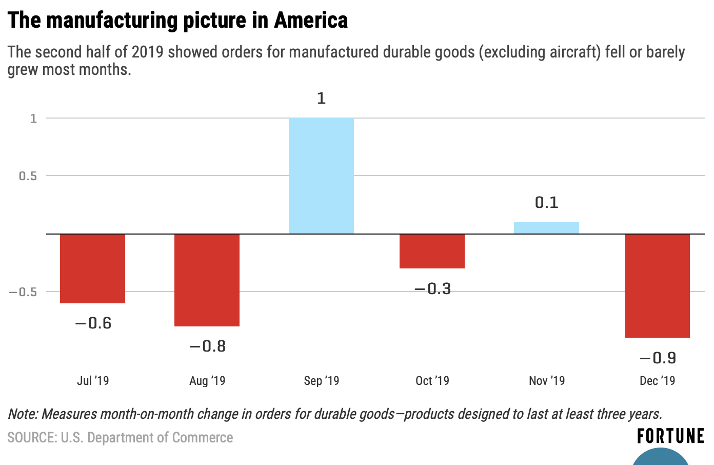 Throughout much of 2019, and particularly in the second half of the year, durable goods orders were more down than up, month-on-month. Maybe a thawing of the U.S.-China trade wars will improve this picture. Or…maybe the coronavirus will exacerbate it.