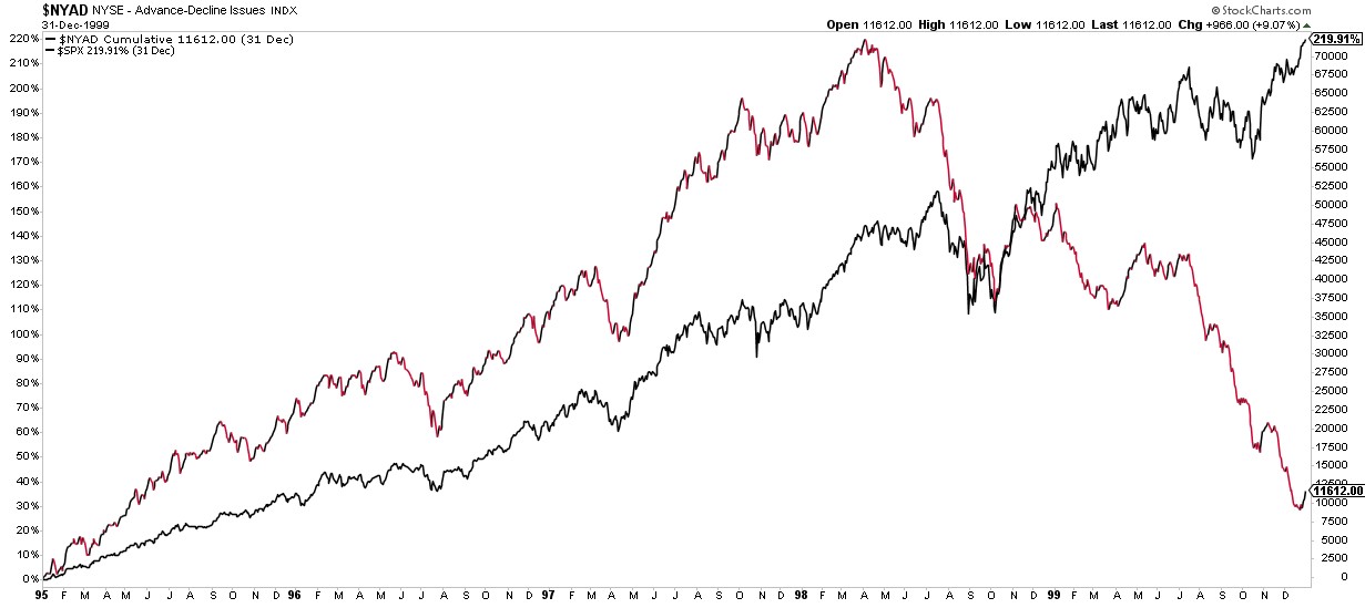 Market breadth is a way to gauge the number of stocks rising versus the number that are falling to understand how much of the market is participating in a rally or downturn. In the late-1990s dot-com bubble, there was a noticeable divergence between the stock market and the NYSE advance-decline line, which simply measures the ratio of the number of stocks rising over the number of stocks falling.