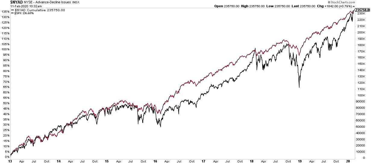 There have been some minor divergences but for the most part the advance-decline line has tracked the upward move in the market. What this tells us is smaller and medium stocks are also rising. This one measure doesn’t tell you exactly when to get in or get out but it can help us understand the underlying health of the stock market.